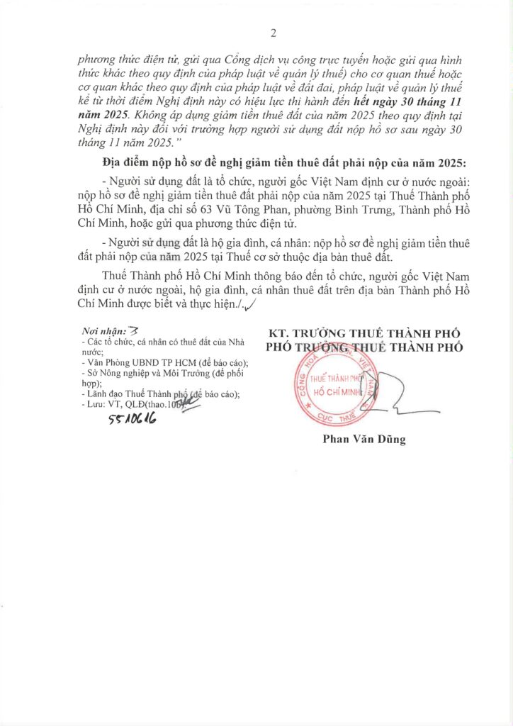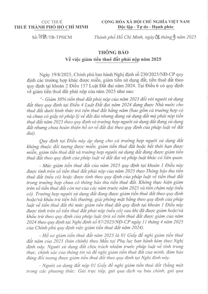 Thuế Thành phố Hồ Chí Minh ban hành thông báo số 7181/TB-TPHCM ngày 08/9/2025 về việc giảm tiền thuê đất phải nộp năm 2025 đến tổ chức, người gốc Việt Nam định cư ở nước ngoài, hộ gia đình, cá nhân thuê đất trên địa bàn Thành phố Hồ Chí Minh được biết và thực hiện.