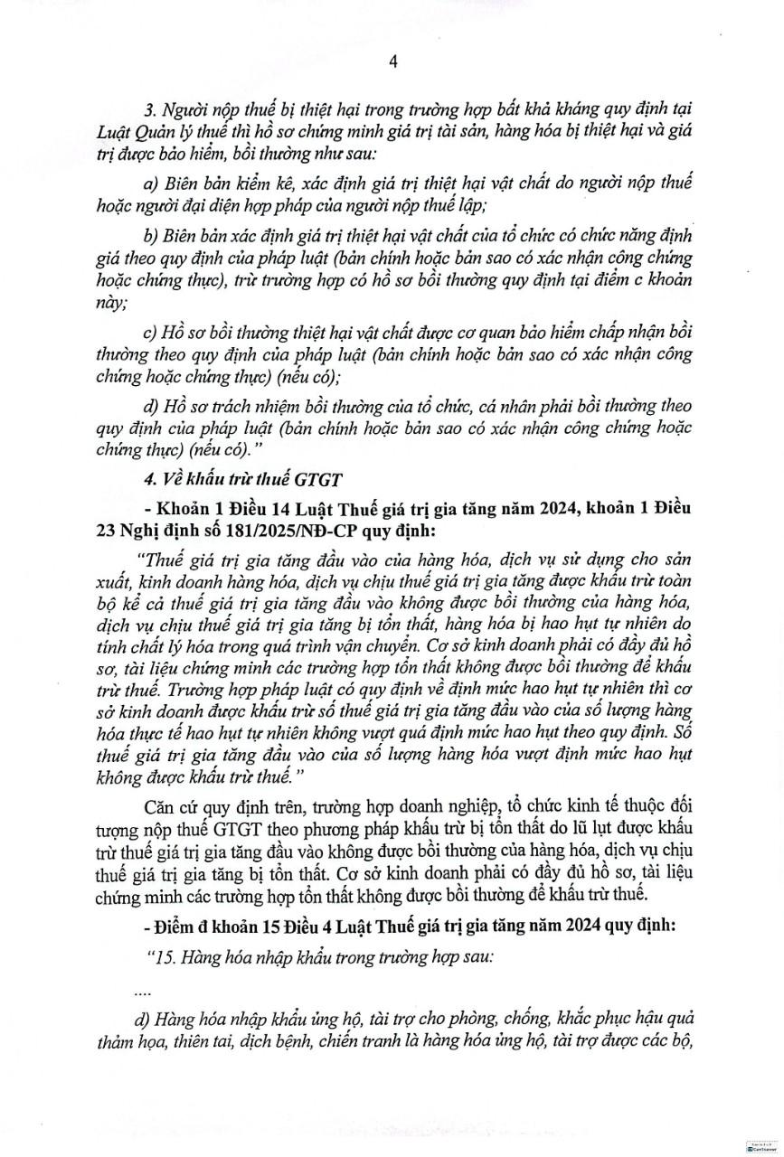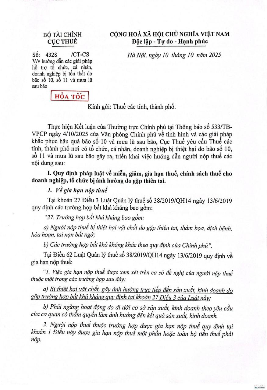 Ngày 10/10/2025 Cục Thuế ban hành công văn số 4328 /CT-CS về hướng dẫn các giải pháp hỗ trợ tổ chức, cá nhân, doanh nghiệp bị tổn thất do bão số 10 số 11 và mưa lũ sau bão.