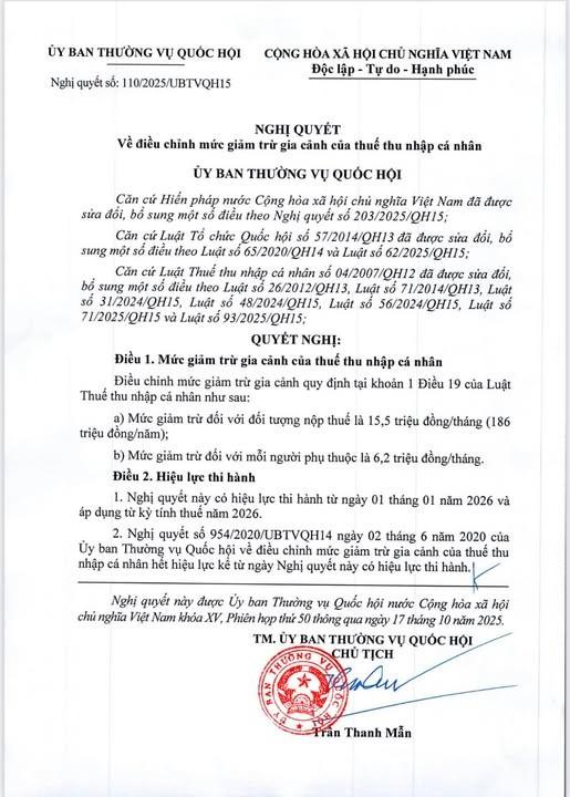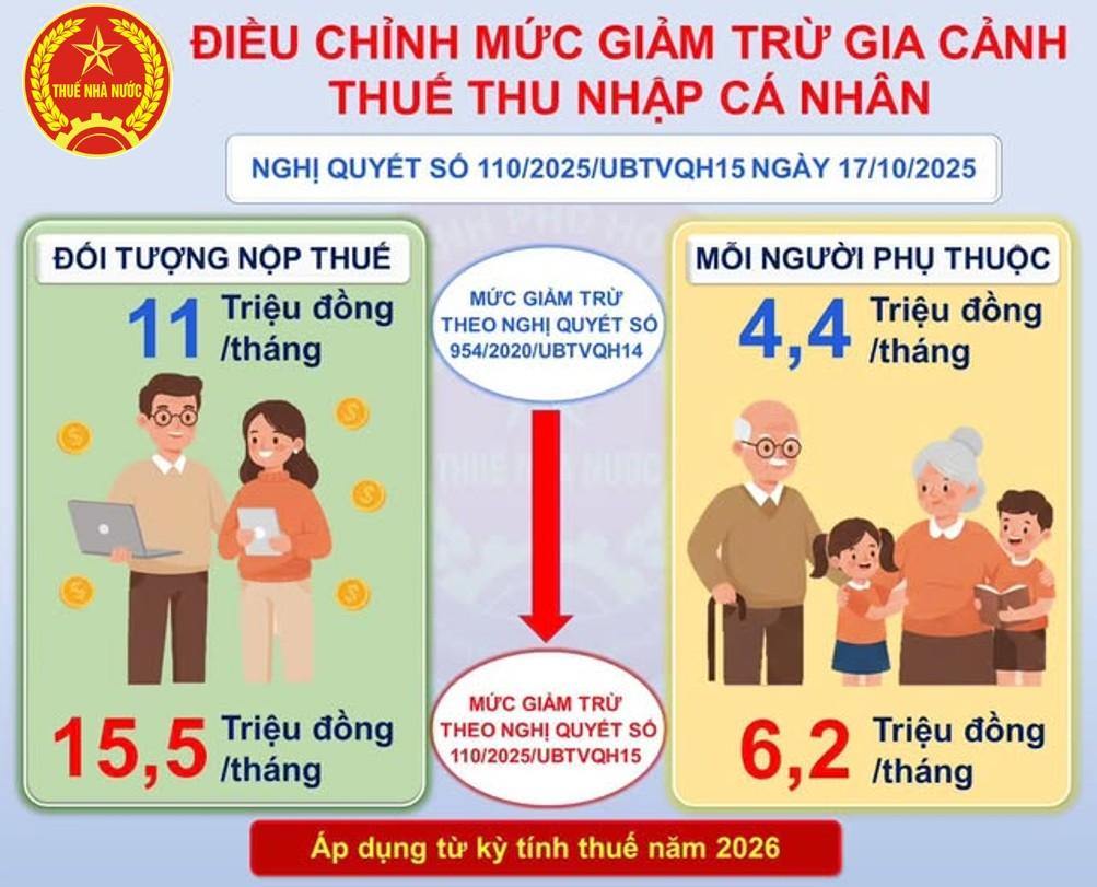 Nghị quyết số 110/2025/UBTVQH15 điều chỉnh mức giảm trừ gia cảnh áp dụng từ kỳ tính thuế năm 2026 như sau: