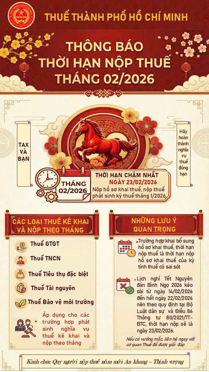 Thuế Cơ sở 14 Thành phố Hồ Chí Minh thông tin đến người nộp thuế một số nội dung cần chú ý trong tháng 02 năm 2026