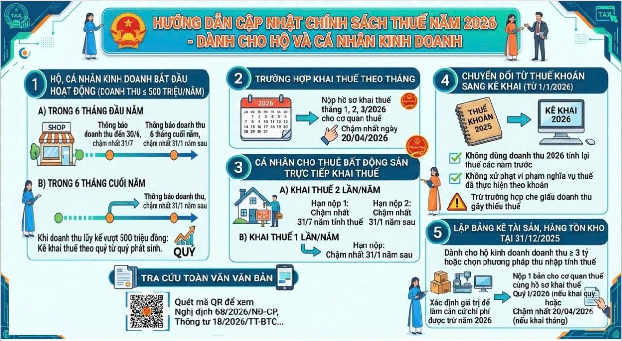 Nghị định 68/2026/NĐ-CP của Chính phủ và Thông tư 18/2026/TT-BTC của Bộ Tài chính quy định về chính sách thuế, hồ sơ, thủ tục về quản lý thuế đối với hộ kinh doanh, cá nhân kinh doanh chính thức được ban hành và có hiệu lực kể từ ngày 05/3/2026.