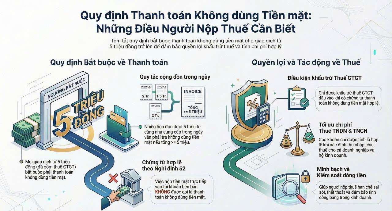 Các doanh nghiệp và hộ kinh doanh bắt buộc phải thực hiện giao dịch qua phương thức phi tiền mặt đối với các đơn hàng có giá trị từ 05 triệu đồng trở lên để được hưởng các quyền lợi về thuế:
