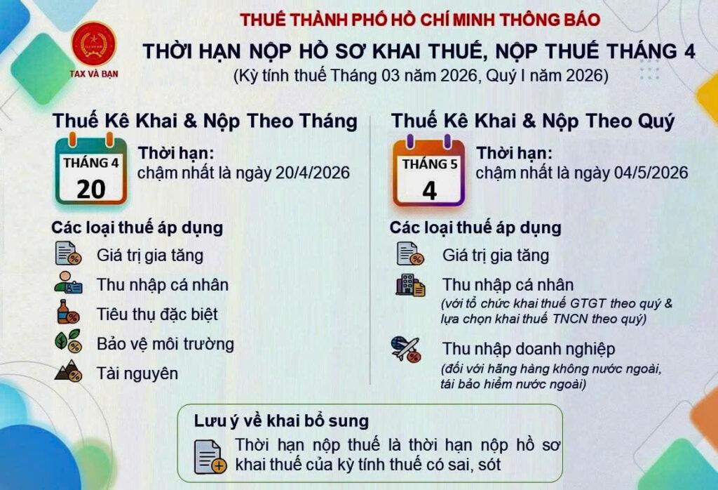 Thuế Cơ sở 14 Thành phố Hồ Chí Minh thông báo thời hạn nộp hồ sơ khai thuế, nộp thuế tháng 4