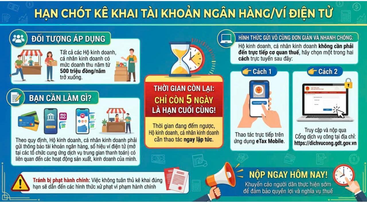 ⏳Chỉ còn 05 ngày nữa là kết thúc thời hạn gửi thông báo tài khoản ngân hàng/ví điện tử phục vụ sản xuất kinh doanh theo quy định.