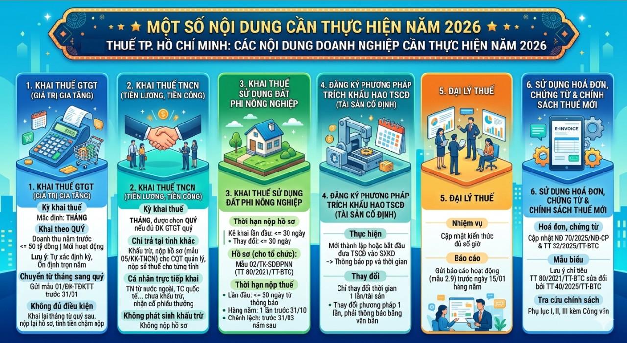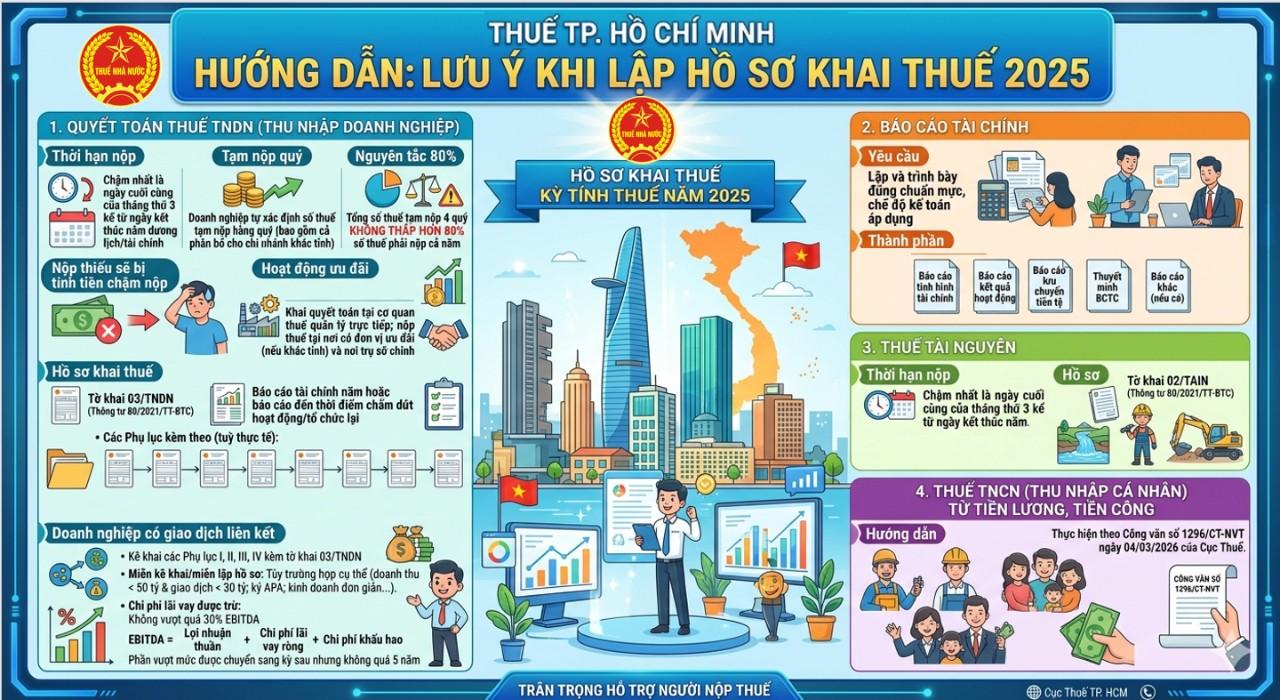 Thuế cơ sở 14 Thành phố Hồ Chí Minh thông tin tới các Doanh nghiệp một số lưu ý khi lập hồ sơ khai thuế cho kỳ tính thuế năm 2025 đối với thuế Thu nhập doanh nghiệp, thuế tài nguyên, thuế thu nhập cá nhân đối với thu nhập từ tiền lương, tiền công và một số nội dung cần thực hiện năm 2026.