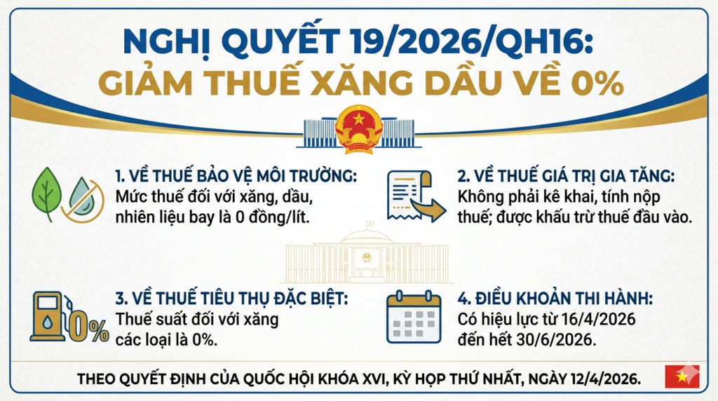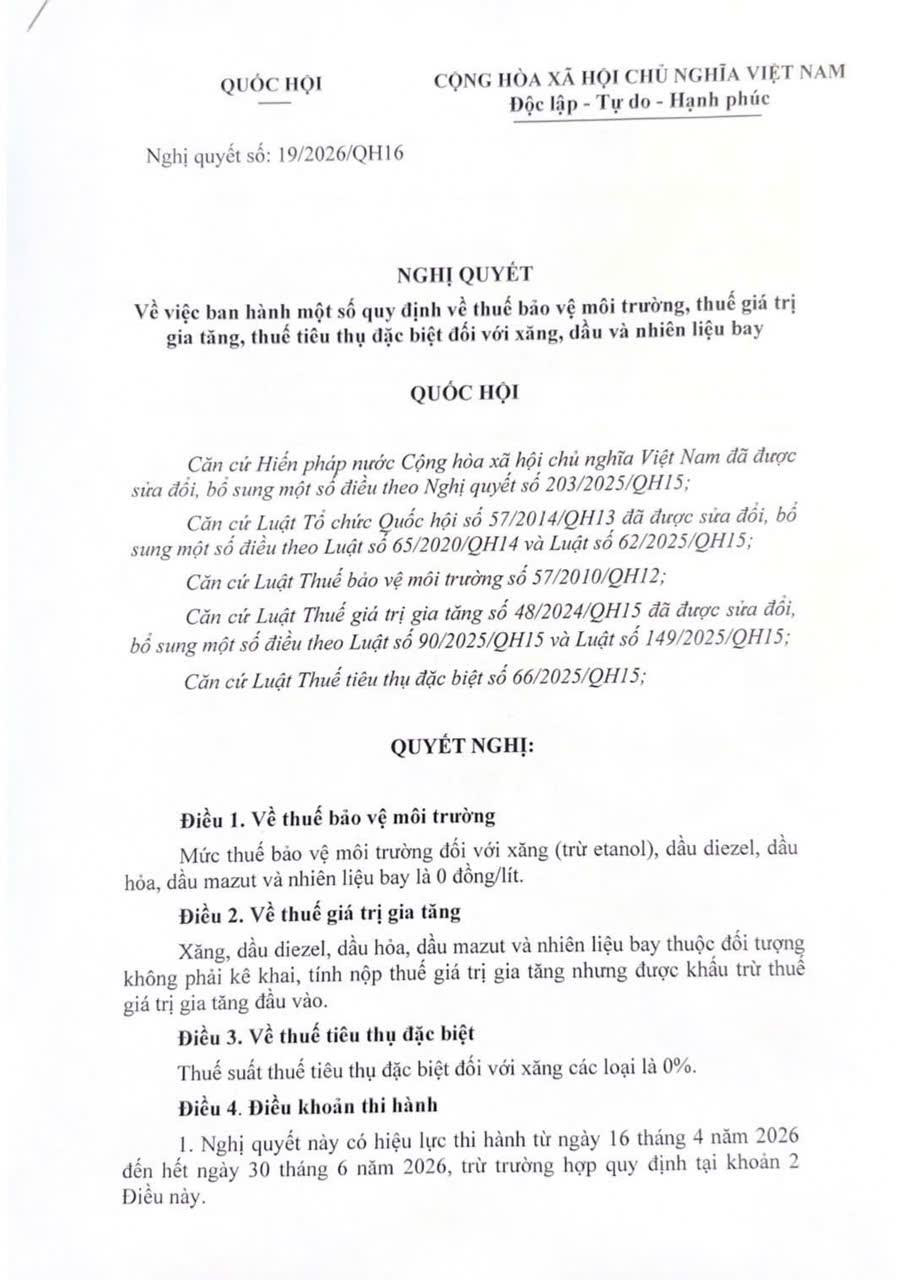 Toàn văn Nghị quyết 19/2026/QH16 về giảm thuế xăng dầu về 0% có nội dung như sau: