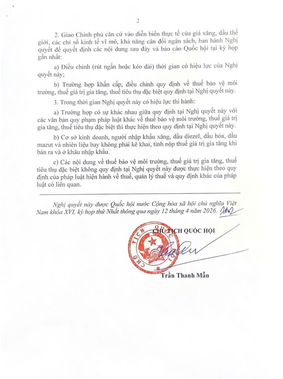 Ngày 12/4/2026, tại Kỳ họp thứ nhất, Quốc hội khóa XVI biểu quyết thông qua Nghị quyết về việc ban hành một số quy định về thuế bảo vệ môi trường, thuế giá trị gia tăng, thuế tiêu thụ đặc biệt đối với xăng dầu và nhiên liệu bay.
