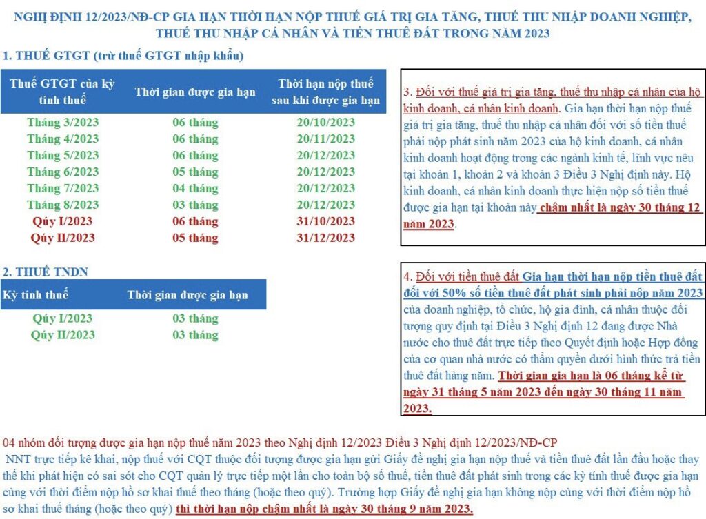Nghị định 12/2023/NĐ-CP ngày 14/04/2023 về gia hạn thời hạn nộp Thuế giá trị gia tăng, Thuế thu nhập doanh nghiệp, Thuế thu nhập cá nhân và tiền thuê đất trong năm 2023 18 Tháng 4, 2023 admindev Tin bài về thuế, Tin tổng hợp, Tin tức, Tin tuyên truyền 0 Chi tiết đính kèm: Nghị định 12/2023/NĐ-CP